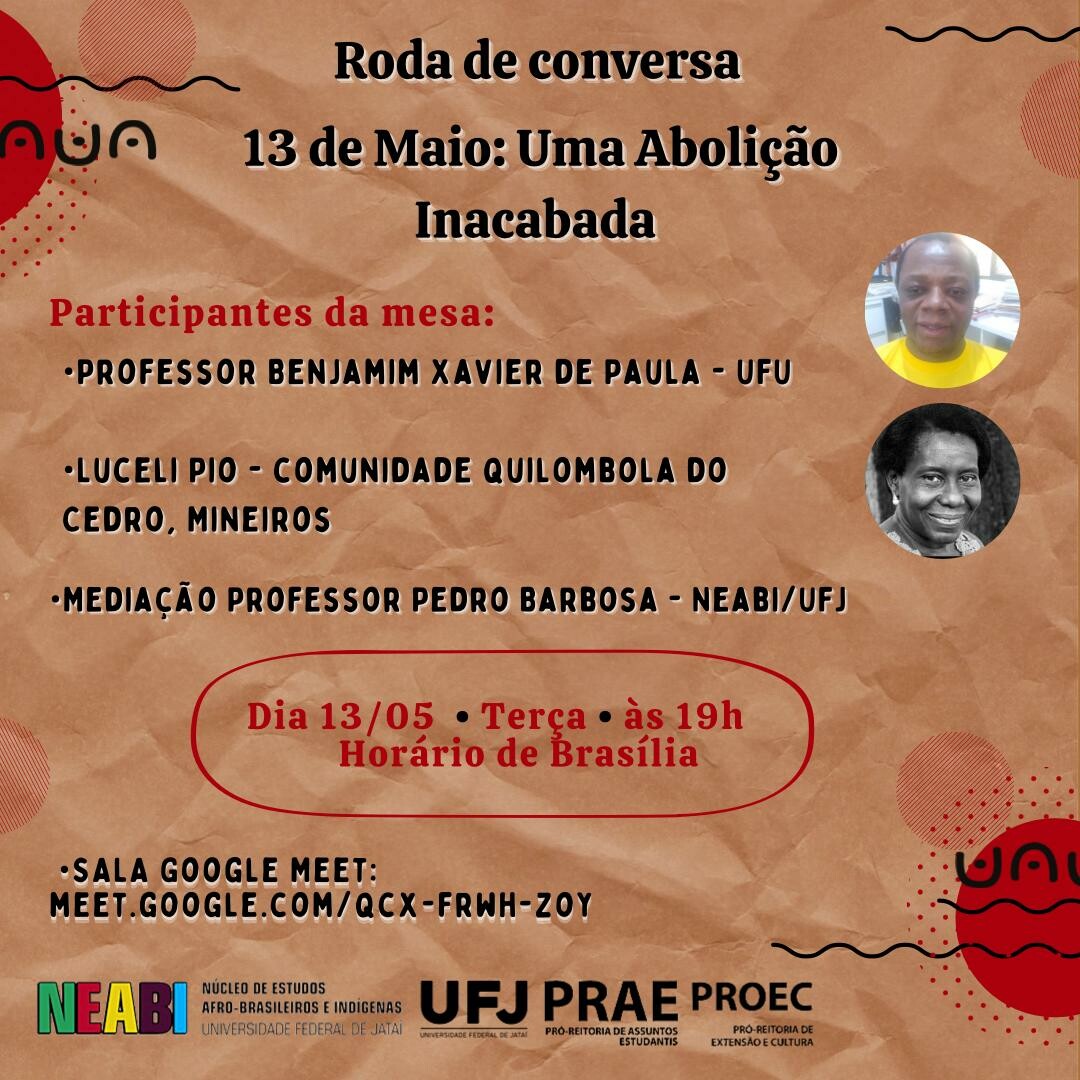 PROEC, PRAE e NEABI vão oferecer uma roda de conversa com o tema "13 de Maio: Uma Abolição Inacabada", com a participação do professor Benjamim Xavier de Paula (UFU), Luceli Pio da comunidade quilombola do Cedro-Mineiros e será mediada pelo professor Pedro Barbosa (NEABI/UFJ). Dê uma olhada nessa programação e participe!